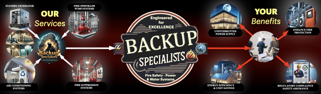 At BACKUP SPECIALISTS, we provide fire safety solutions, backup power, and climate control systems tailored to your needs. Our end-to-end services ensure compliance, reliability, and safety across all projects.